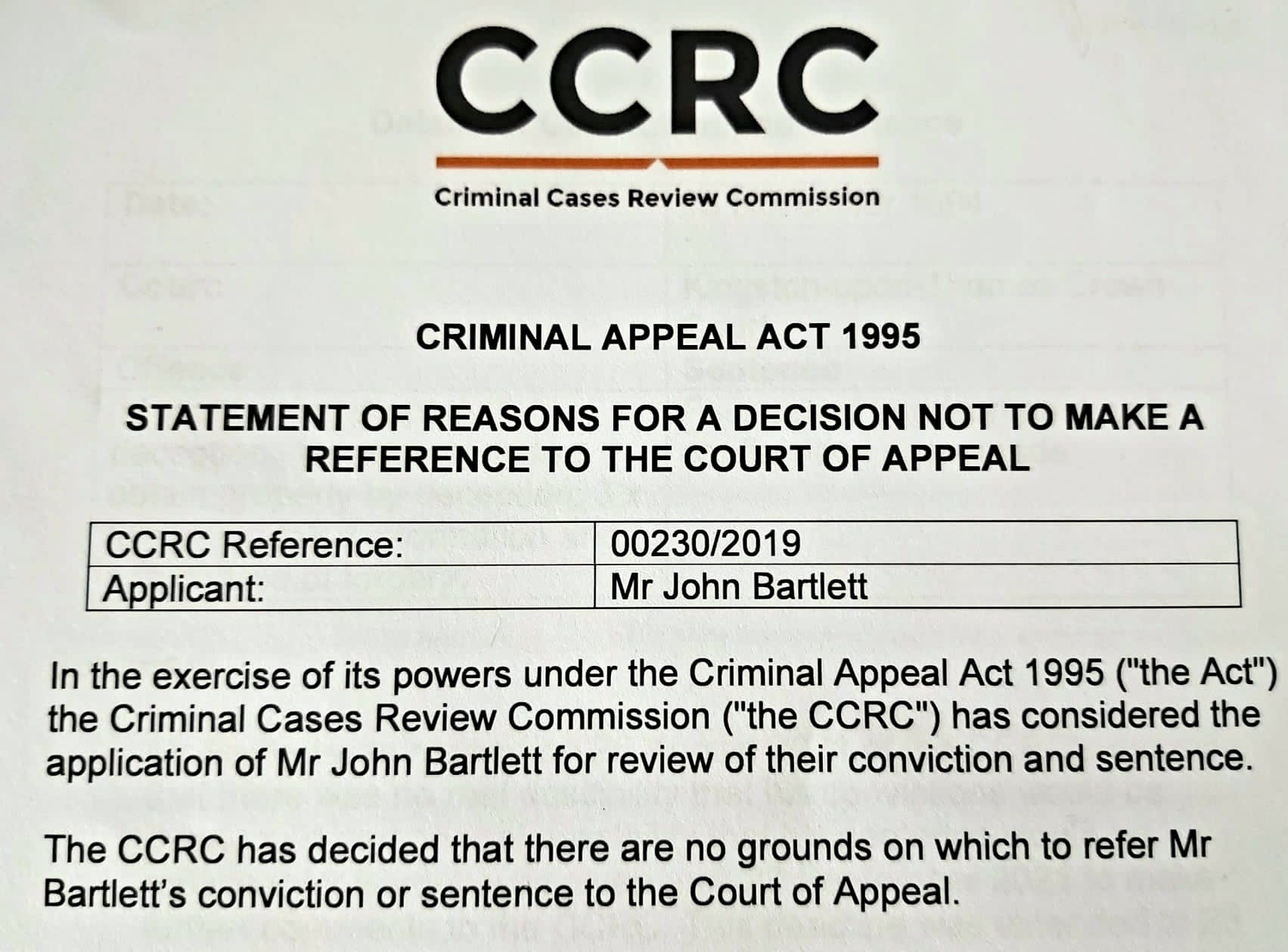 The CCRC refused to view important new evidence in the form of a 3 minute ITV news recording that had just been located. No one, including myself, was ever interviewed throughout the Review process. In the 156 weeks taken to review my case, one important Crown Witness that the CCRC knew had a terminal illness and who had wished to provide critical evidence, was ignored and subsequently died (click link to read this witness’s statement to the CCRC).