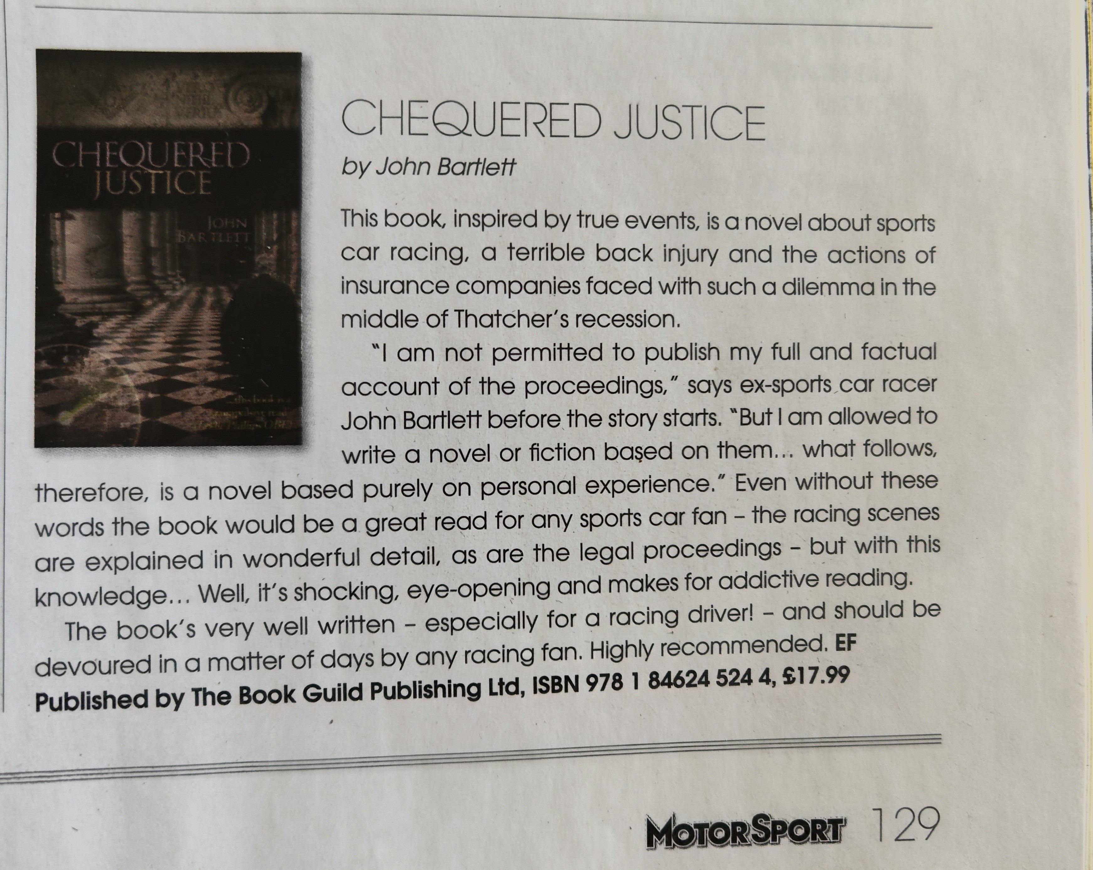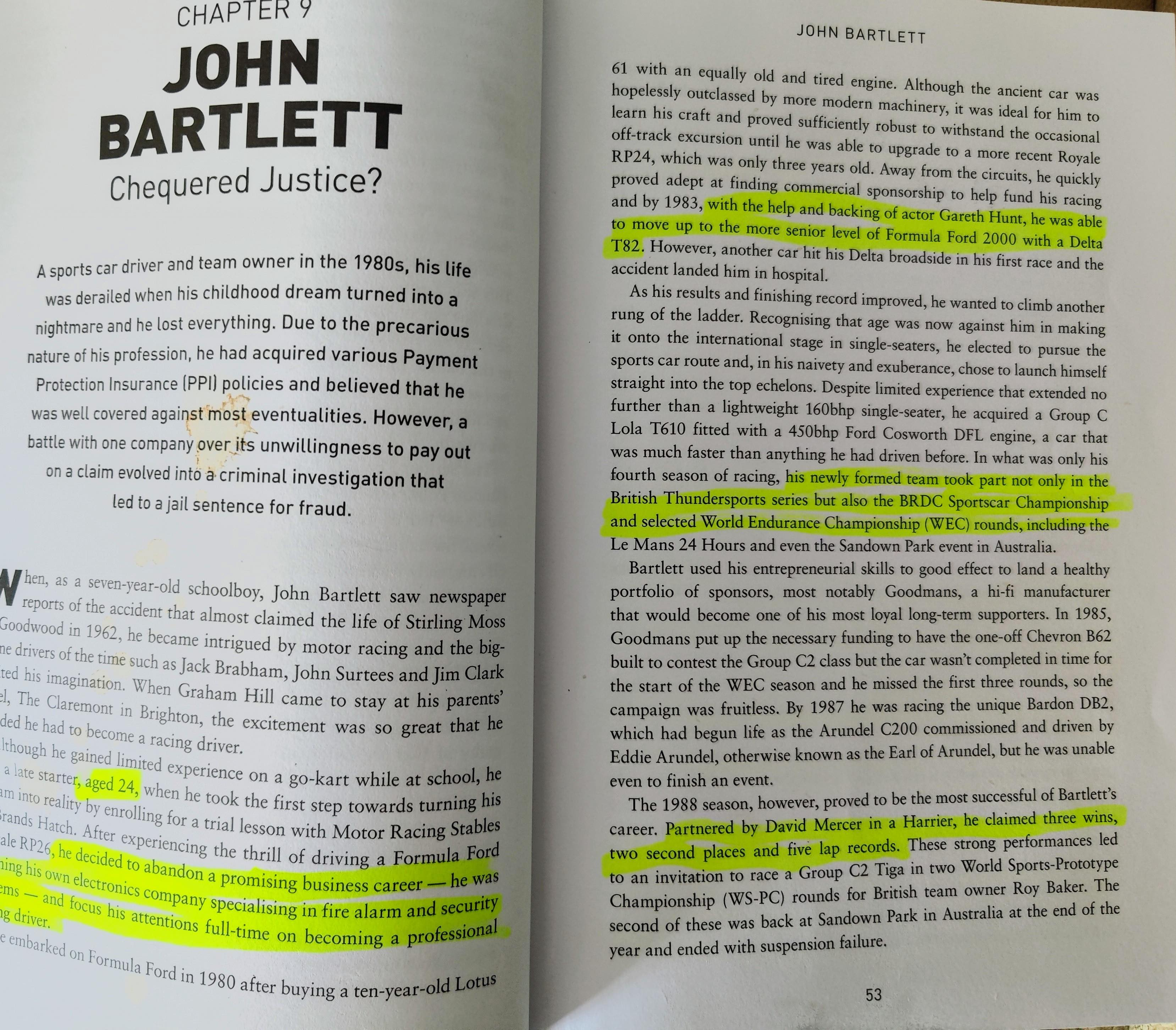 John Bartlett (born 19th January 1955) is best known as a former WSCC race driver and Team owner from the 1980’s. Following a serious horse riding accident in 1988 and major legal wrangles with his insurers (see below), Bartlett retired from motorsport in 1993. Although severely dyslexic[3], his first novel, based on his experience within the British legal system, was published in 2010[4].