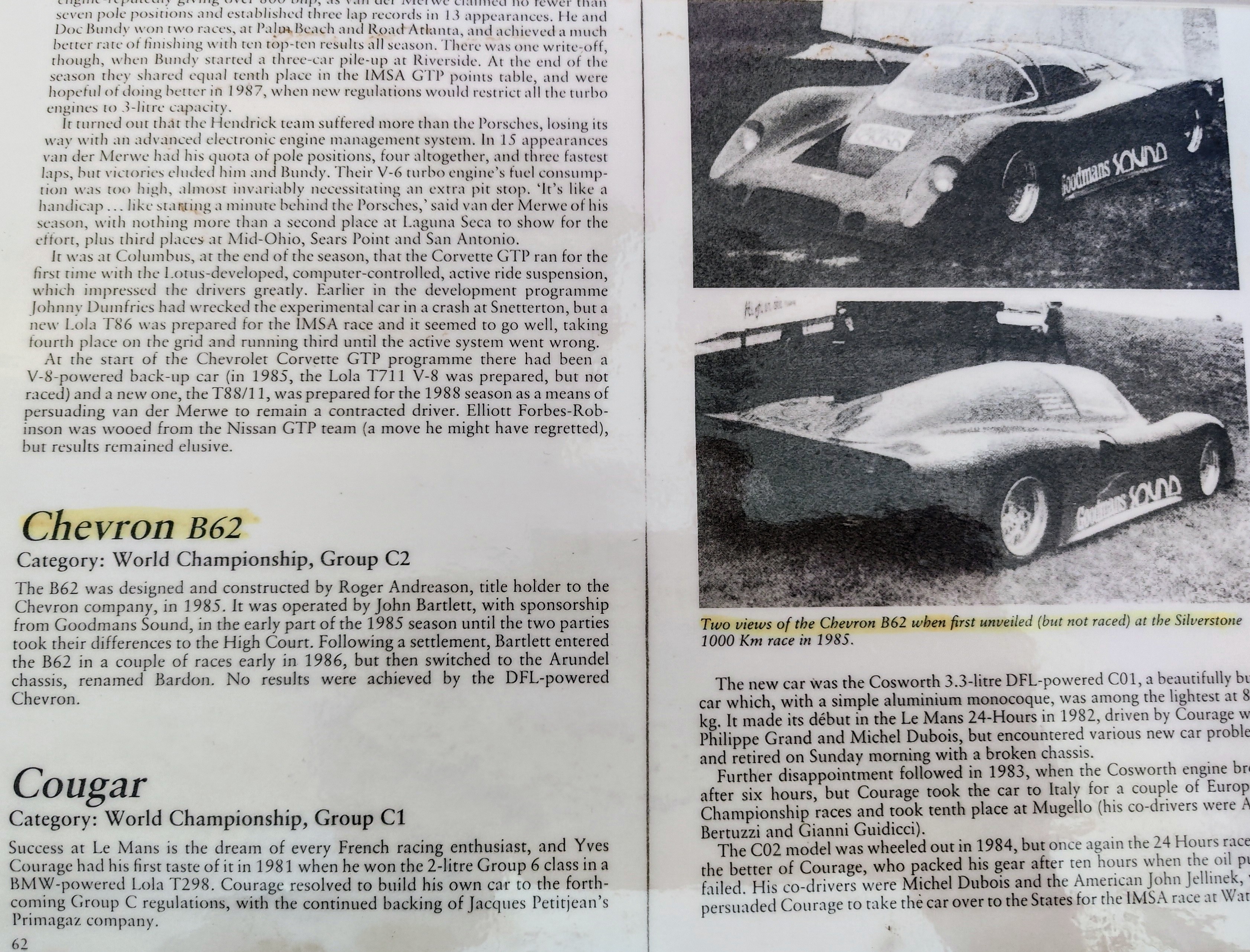 John Bartlett started racing FF1600 cars (Lotus 61) in 1979 before moving into Group C Sports Car Racing . In 1983 he began to establish himself as a sports car driver in the British Thundersports series and the BRDC Sportscar Championship, securing 3 wins, 2 second places and 5 lap records[ISBN 978-1-910505-70-0 – 2022: P. 53]. In 1984 he became a World Sportscar Championship driver[ISBN 978-1-910505-70-0 – 2022: P. 53], competing in Group C prototypes and in the American IMSA Camel Lights (driving Spice SE87L & SE88P)[11]. That year Bartlett also established his own WSCC Team (Grand Prix Racing Promotions), competing around the world, including the Le Mans 24 Hour[13] in 1984, 85, 86 and 87[14]