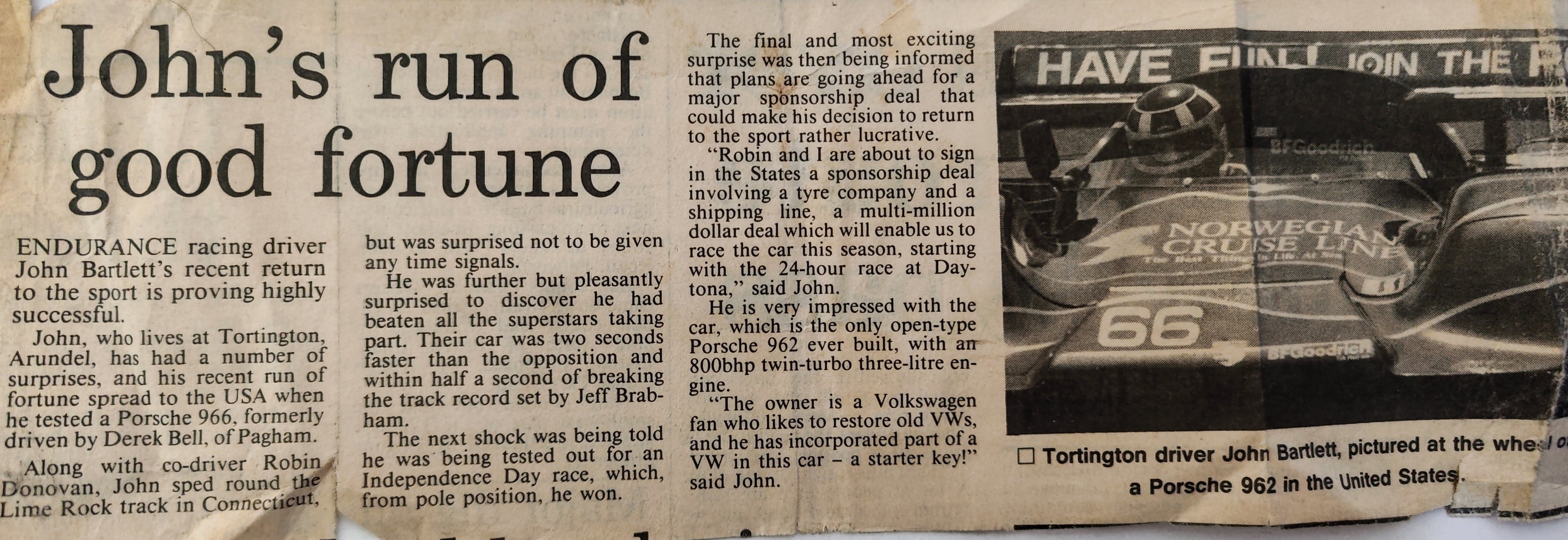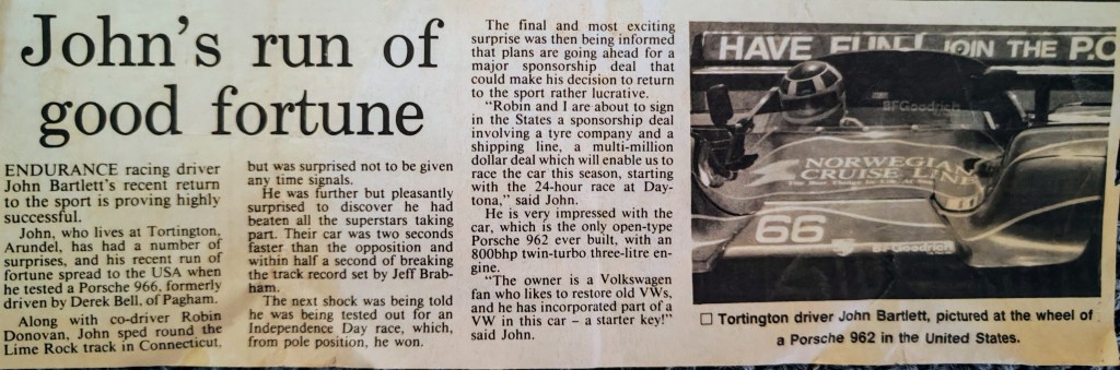 In 1988 Bartlett was seriously injured in a horse riding accident[ISBN 978-1-910505-70-0 – 2022: P. 53] but for over three years, medical professionals failed to correctly identify significant spinal fractures, flattened nerves and broken vertebrae[16]. As a result, he continued trying to compete with severe spinal injuries, winning Class A and securing fastest lap at the Esso Willhire 24 Hour in 1991[EVRO Publishing – ISBN 978-1-910505-70-0 – 2022: P. 53][18], with Robin Donovan. Bartlett also won at the Lime Rock Independence Day Trophy race (IMSA GTP class) on 4th July, driving a prototype Porsche 966, developed from the Porsche 962, by Gunnar Racing in Florida[19].