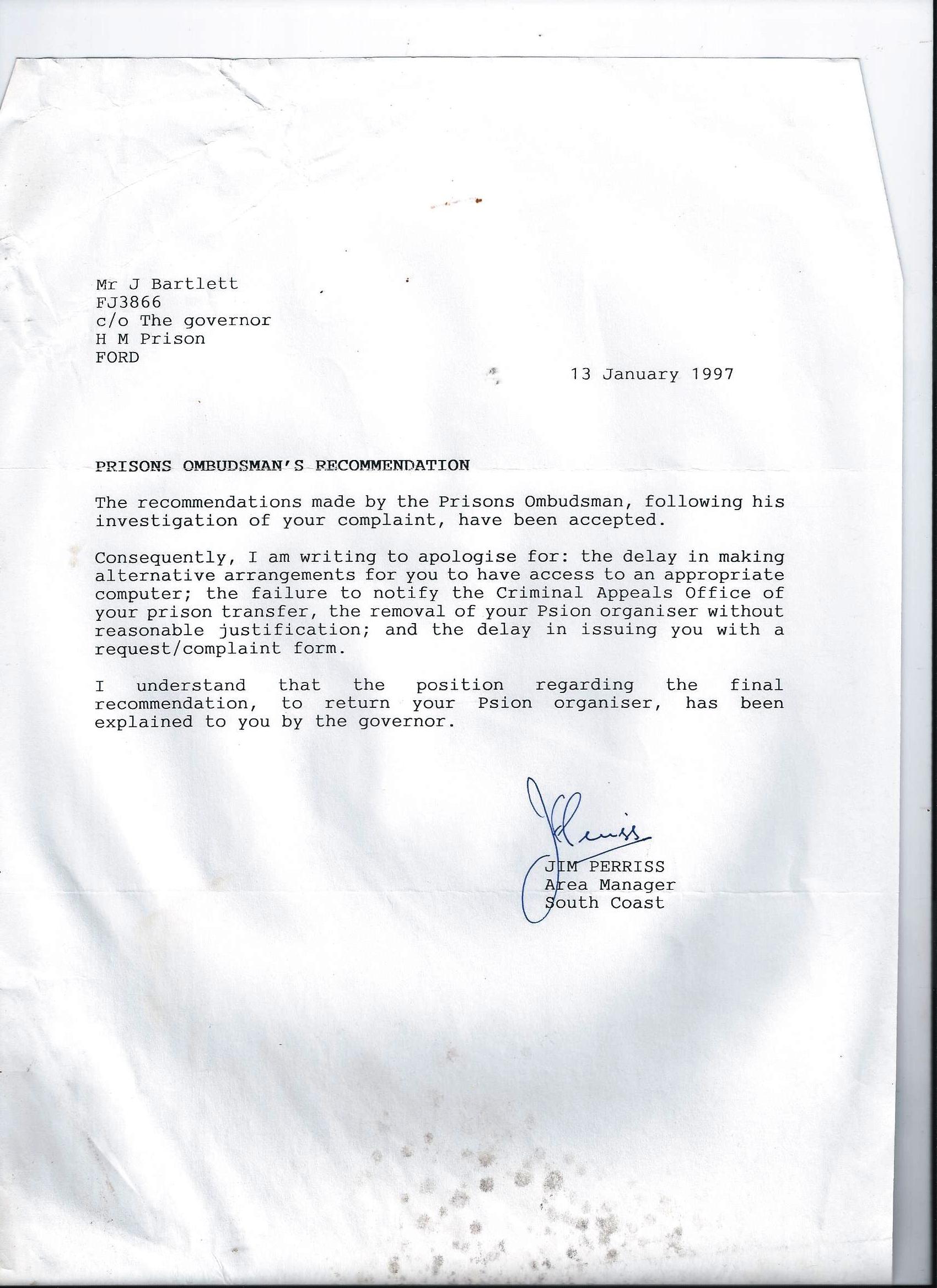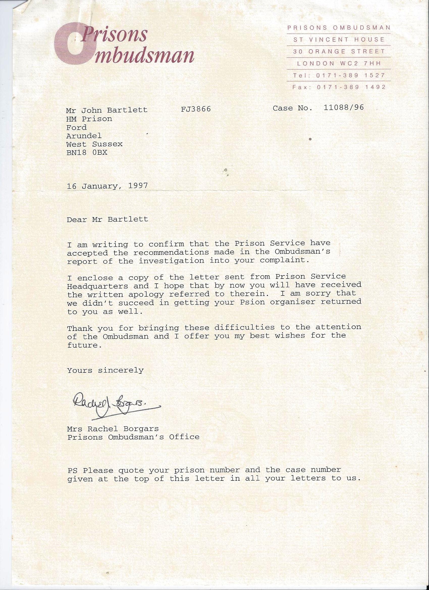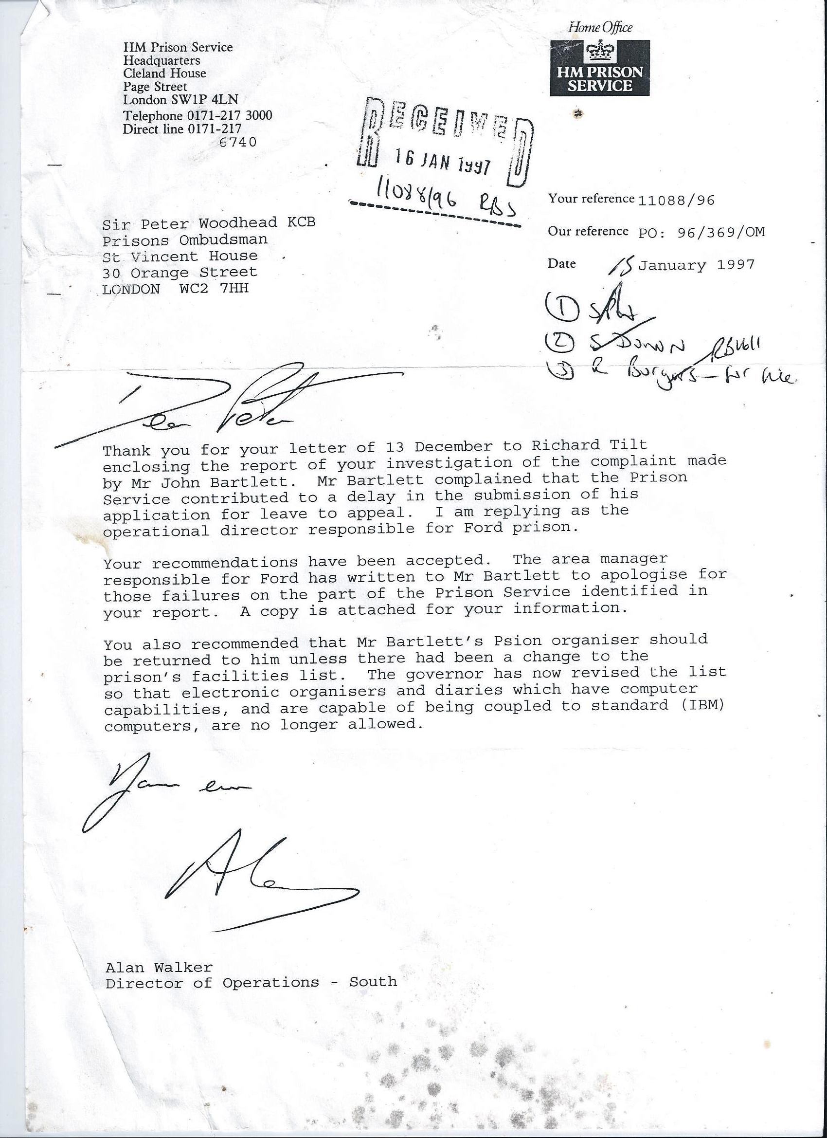 - HM Prison Service write to Sir Peter Woodhead KCB saying the Ombudsman’s report into my complaint has been accepted by The Home Office & HM Prison Service and that they will apologise to me.