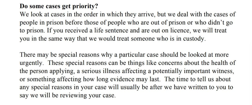 Case Review Time: As at July 2022 the CCRC are still publicly boasting that the review time for cases is between 31 to 40 weeks and even quicker if there are special reasons, such as the health of the person applying, as in my case…