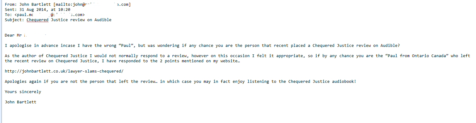 I’m sure Paul’s review won’t exactly help distribution, however his unwitting “proof reading” of the legal proceedings simply adds credence to the injustice I and so many others have had to endure.  Paul appears to confuse the “manipulation” depicted in Chequered Justice with what he perceives to be flaws or textual errors…  in effect saying it couldn’t happen in real life.  He’s also managed to completely miss the subtle hints in the audiobooks sound track (e.g. at 4.23), signalling when a spot of “judicial tinkering” is taking place (have a listen to the offending chapter above)!