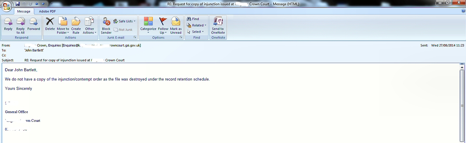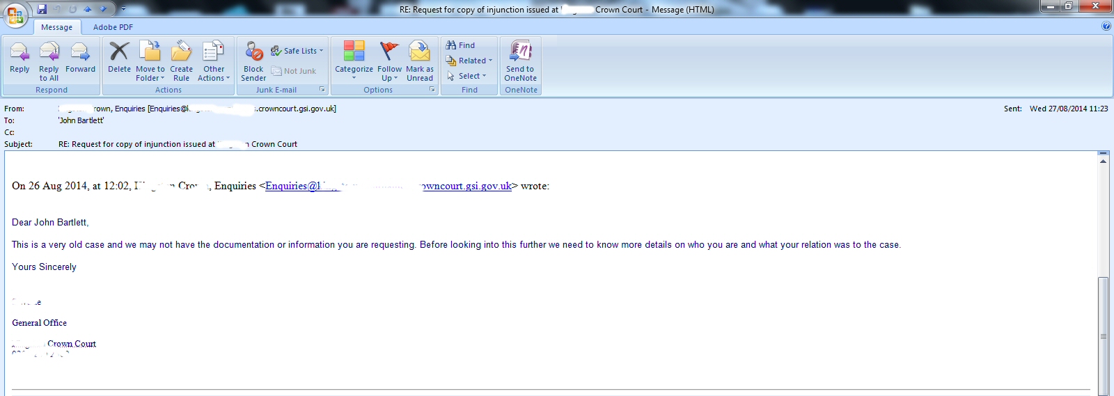 On 22nd August 2014 I made a Freedom of Information Request to release a copy of the injunction that “Paul” suggests couldn’t have been issued.  On 26th August I received this rather spooky “who are you?” reply: